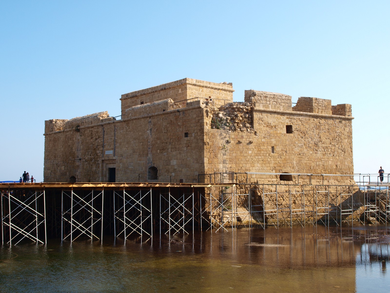 Это — замок Пафоса. Для посещения не рекомендуется: пуст и дорог. Замок лучше в Ларнаке посмотреть (завтра выложу). Строили эту башню — вернее, башни, изначально их было две — византийцы, потом лусиньянцы (французский род, что здесь правил) достраивали, а в 1570-м пришли венецианцы и всё взорвали до основания — не сволочи ли? Туркам потом восстановили только одну из двух башен, использовали её как форт и тюрьму. Британцы превратили замок в соляной склад, а в прошлом столетии признали его историческую ценность, стали беречь и туристам показывать. А склад неплохой был, наверное…